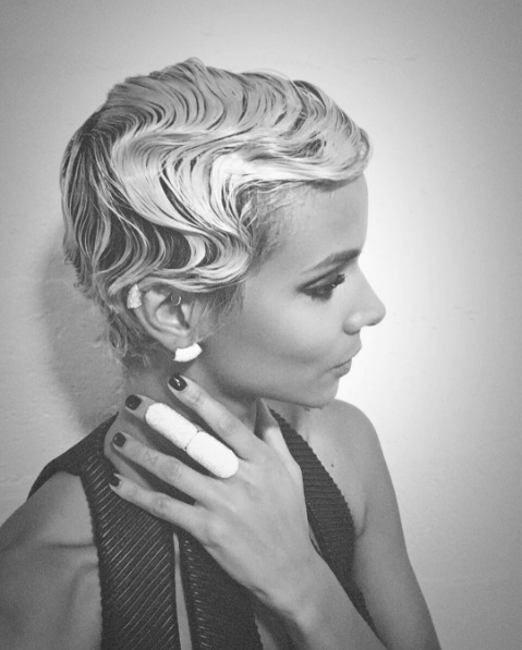 Mais la chanteuse a été surtout remarquée par sa nouvelle coupe de cheveux très courte blond platine coiffée à la manière rétro pour l'occasion.