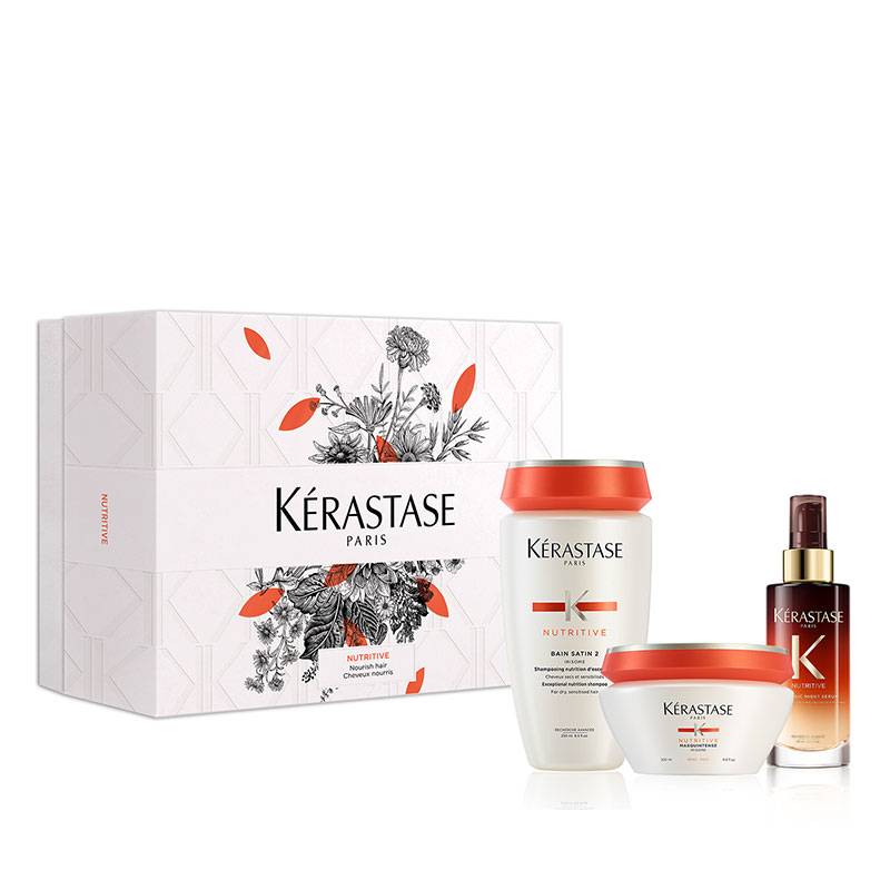 Le coffret Nutritive pour cheveux secs est composé de 3 soins dont le Bain Satin 2 offert ! 3 étapes de soins pour des cheveux nourrit en profondeur. Le bain Satin 2 de la gamme Nutritive de Kérastase est un shampoing pour cheveux secs à très secs, apportant à vos cheveux de la brillance, douceur et nutrition grâce à ses actifs nutritifs.Le Masquintense pour cheveux épais et secs de Kérastase, nourrit en profondeur la fibre du cheveu tout en laissant un aspect doux et brillant grâce à sa texture riche concentrée de glucides et de protéines. L'extrait de Rhizome d'Iris permet de protéger les cheveux de l'oxydation et démêler les cheveux.Le Sérum de nuit Nutritive est un soin de nuit sans rinçage permettant de nourrir progressivement et durablement les cheveux durant la nuit. Le soin de nuit est conçu pour compenser la perte de nutriments durant la journée. Vos cheveux seront réparés, nourrit en profondeur, brillant et lisse grâce à son mélange de 5 vitamines (dont la vitamine E) pour sceller les fourches et écailles du cheveu et pour un effet anti-frisottis. Après votre soin vos cheveux seront doux, brillant, soyeux et démêler ! Pour des cheveux souples, nourrit et soyeux avec le coffret Nutritive pour cheveux secs de Kérastase !