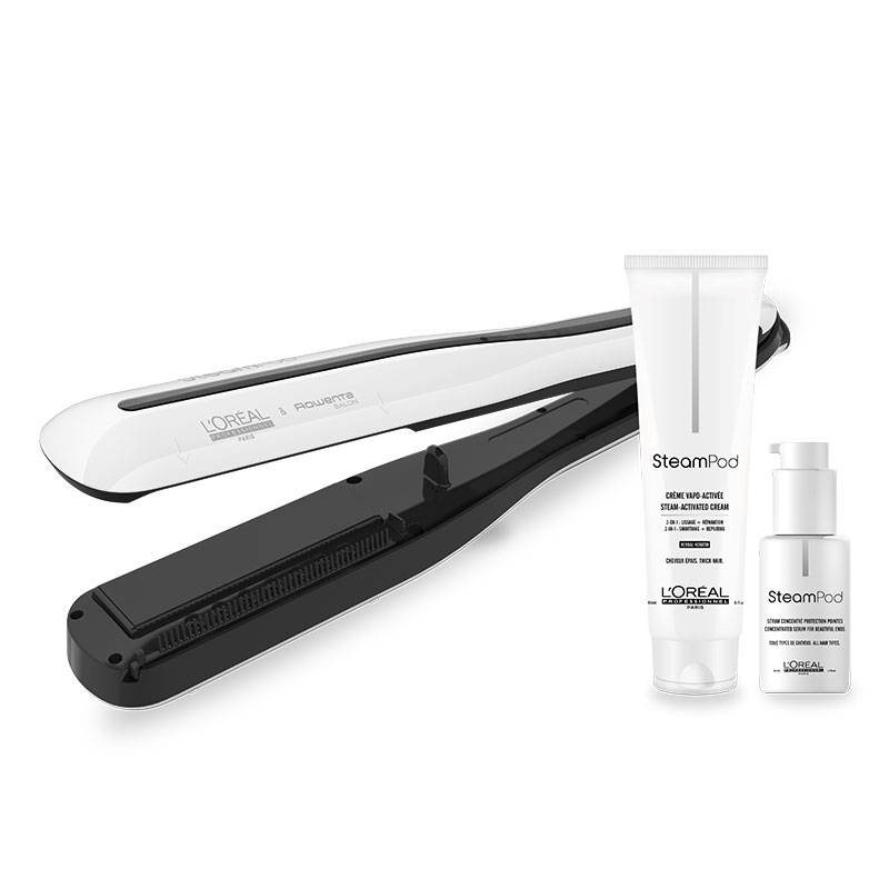 Découvrez le nouveau Steampod 3.0 l’Oréal Professionnel grâce à ce pack complet spécialement conçu pour les cheveux épais. Ce pack contient :- Le lisseur vapeur Steampod 3.0 : il s’agit d’une nouvelle version qui propose de réelle innovation comme le réservoir intégré à l'appareil ce qui permet une plus grande liberté de mouvement. De plus le Steampod 3.0 est moins lourd et permet désormais de créer tous les styles en lissant mais aussi en ondulant ou bouclant les cheveux au gré de vos envies !- La crème de lissage Steampod, qui s'active au contact de la vapeur et permet de préparer le cheveu mais également de le protéger et de le nourrir pour un résultat souple, brillant et soyeux.- Le sérum Steampod à appliquer avant mais aussi après le passage du Steampod pour une brillance incroyable et une nutrition parfaite des longueurs et des pointes